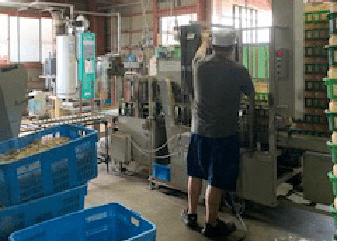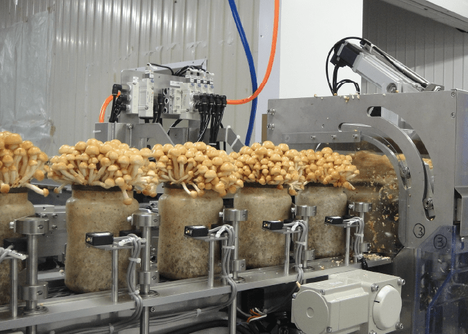 1つの瓶から2回収穫しています。一番採りは機械で収穫しますが、収穫後の瓶からもう一度生えてくる二番採りのなめこは、大きく不揃いな形で育つため、手作業でひとつひとつカットします。