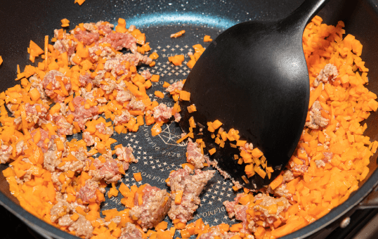 サラダ油(分量外)を熱したフライパンで、3と合い挽き肉を中火で炒める。