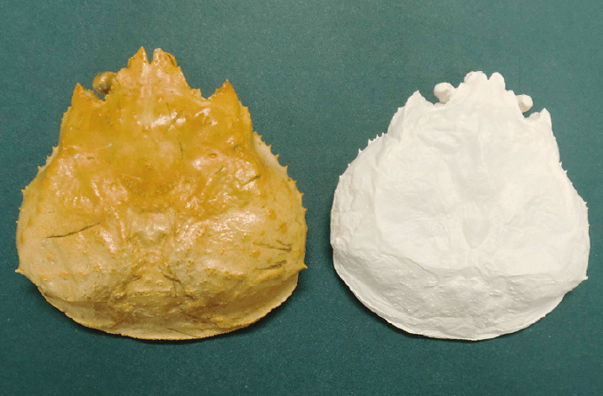加工前のカニ殻(左)とキチンを抽出したカニ殻(右)。