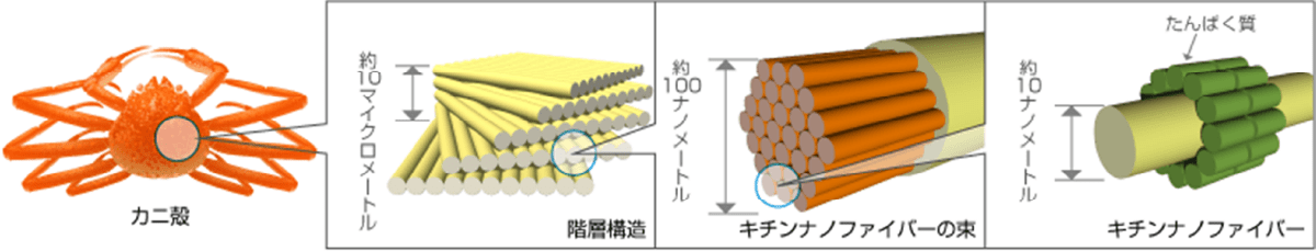 “キチンナノファイバー”とは、乾燥させたカニ殼などの甲殻類の外皮から抽出したキチンという物質を粉砕し、直径約10ナノメートル(髪の毛の太さの約1万分の1)というサイズまで微細化したものです。