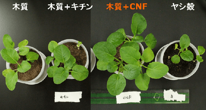 写真は、小松菜におけるキチンナノファイバーの成長促進効果を確かめる実験の様子です。鳥取大学の研究では、植物にキチンナノファイバーを肥料として与えると、成長が促進されることや、あらかじめキチンナノファイバーを植物に散布しておくと、病害抵抗性が誘導され、立ち枯れを抑制できることが確認されています。