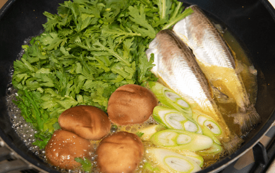 淡白な味わいのハタハタと香り豊かな春菊、そして秋田県の伝統的な調味料であるしょっつる、それぞれの風味を生かした鍋風カレー。独特の香りとほのかな苦味の春菊は、あっさりした鍋風カレーの中で良いアクセントになります。お好みのきのこや白菜などを加えて、アレンジするのもおすすめです。
