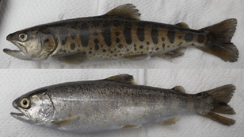 非銀化ヤマメ(上)と銀化ヤマメ(下)