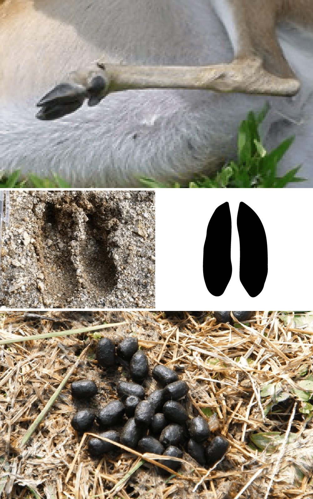 上段:ニホンジカの脚(蹄の様子)、中段:足跡、下段:糞