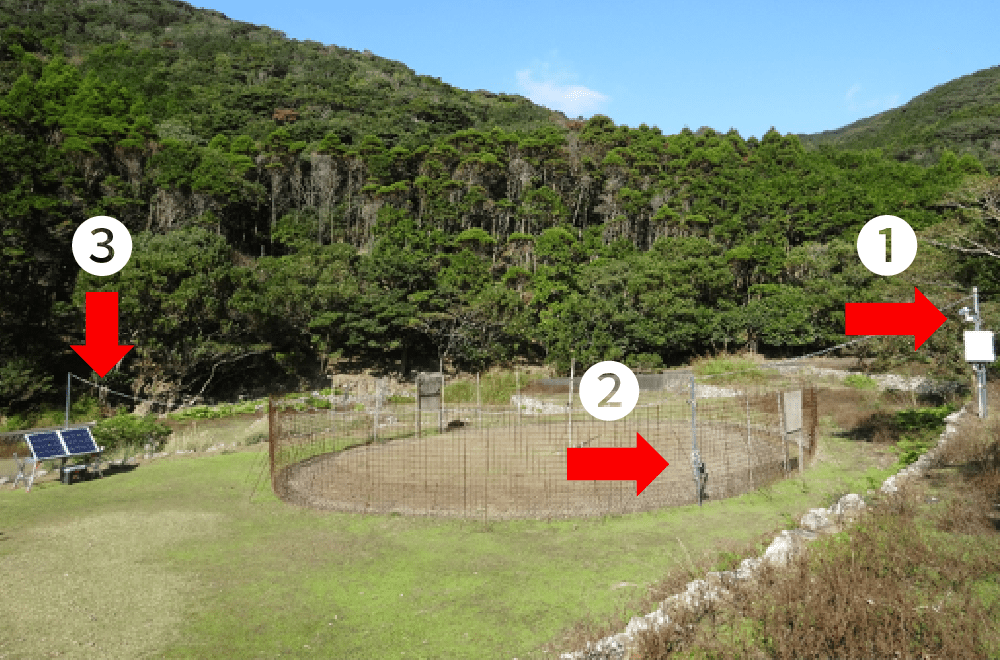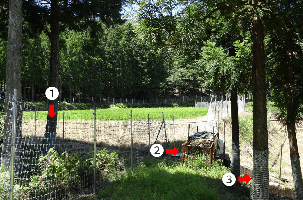 1 金網柵 2 箱罠 3 樹皮への防護ネット巻付け