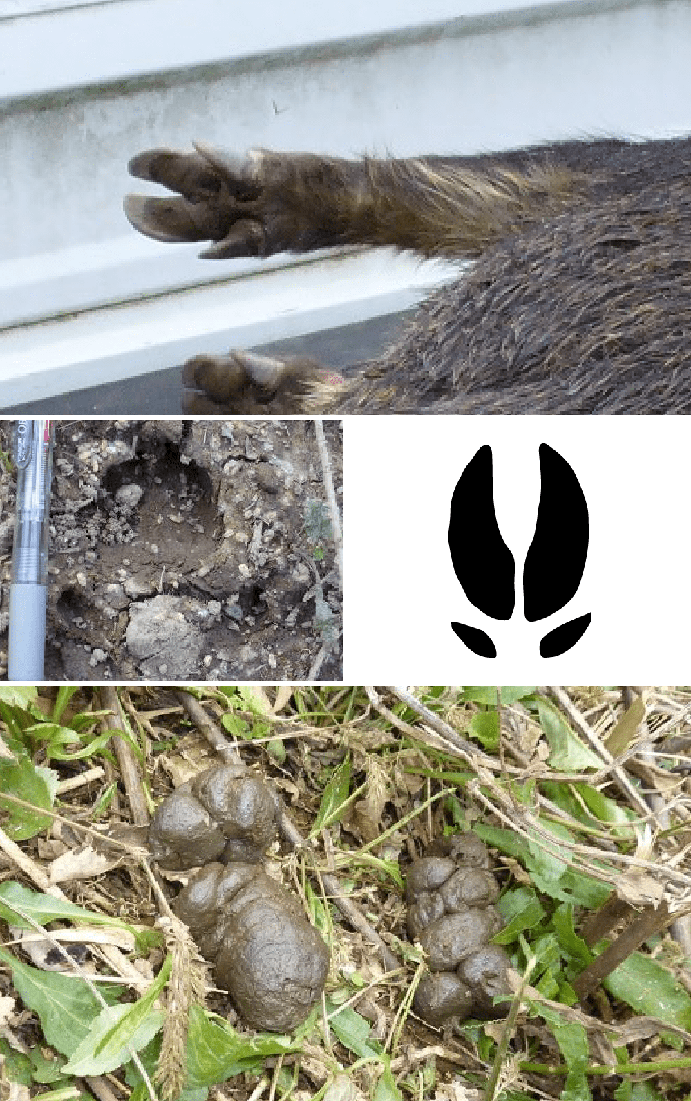 上段:ニホンイノシシの脚(蹄の様子)、中段:足跡、下段:糞