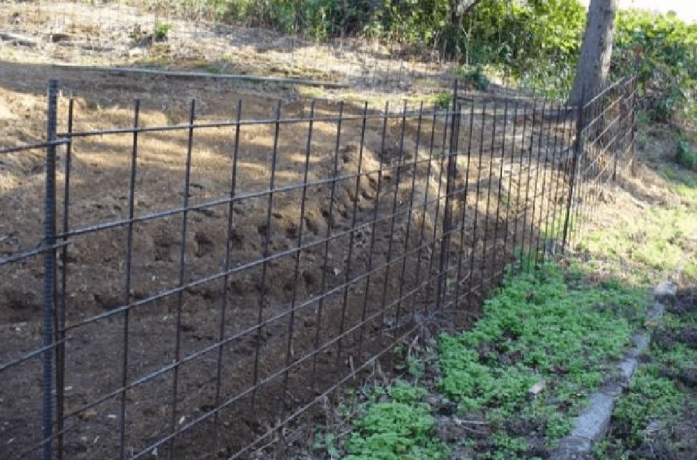 イノシシに侵入され折れ曲がったワイヤーメッシュ柵