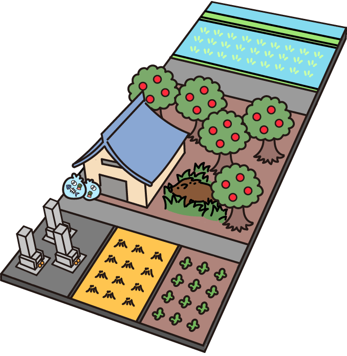 雑草や草木が生い茂り、見通しの悪い場所は、動物の隠れ場所やエサを食べる場所になってしまいます。また、動物が人に姿をさらすことなく農地にアクセスできる環境を作ることにもなります。藪の刈払いや間伐などの対策を行い、明るく見通しの良い環境をつくることが大切です。