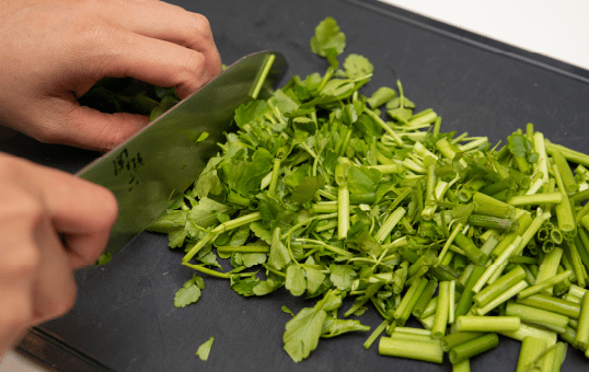 宮城県におけるせりの栽培の歴史は古く、江戸時代には同地域に自生する野生種を利用した栽培が行われていたといわれています。県内生産量の約6割を名取市、約3割を石巻市で生産しており、2018年の作付面積、収穫量、出荷量はいずれも全国1位です。9月から3月にかけて出荷される「根せり」と、4月から6月にかけて伸びた新芽を摘んで出荷される「葉せり」があり、特に厳寒期は一番風味がありおいしいといわれています。最近はせり鍋が人気となっており、葉、茎、根でそれぞれ違う味や食感が楽しめるのも魅力です。