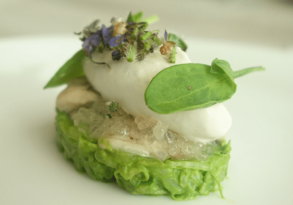 北海道厚岸産の生牡蠣の上には生牡蠣のババロア、下にはロメインレタスと新潟県産コシヒカリを使ったリゾットがしかれています。