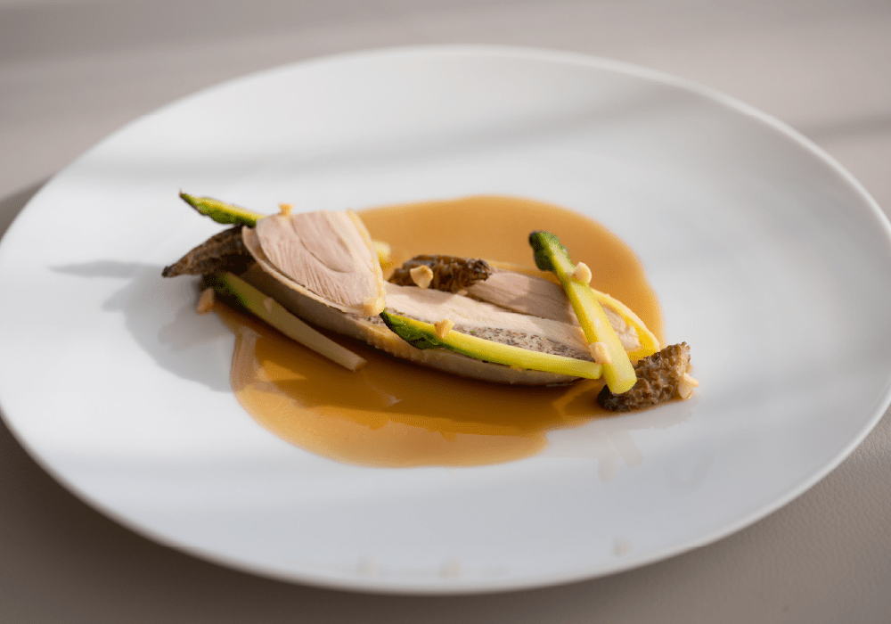 長野県・有明山農場の軍鶏を丸ごと煮た後に、さまざまな野菜やジロール茸とともに、ヴァン・ジョーヌ(仏・ジュラ地方産の黄ワイン)に一週間ほど漬けたもの。噛みしめるごとに繊細で複雑な旨味が広がります。