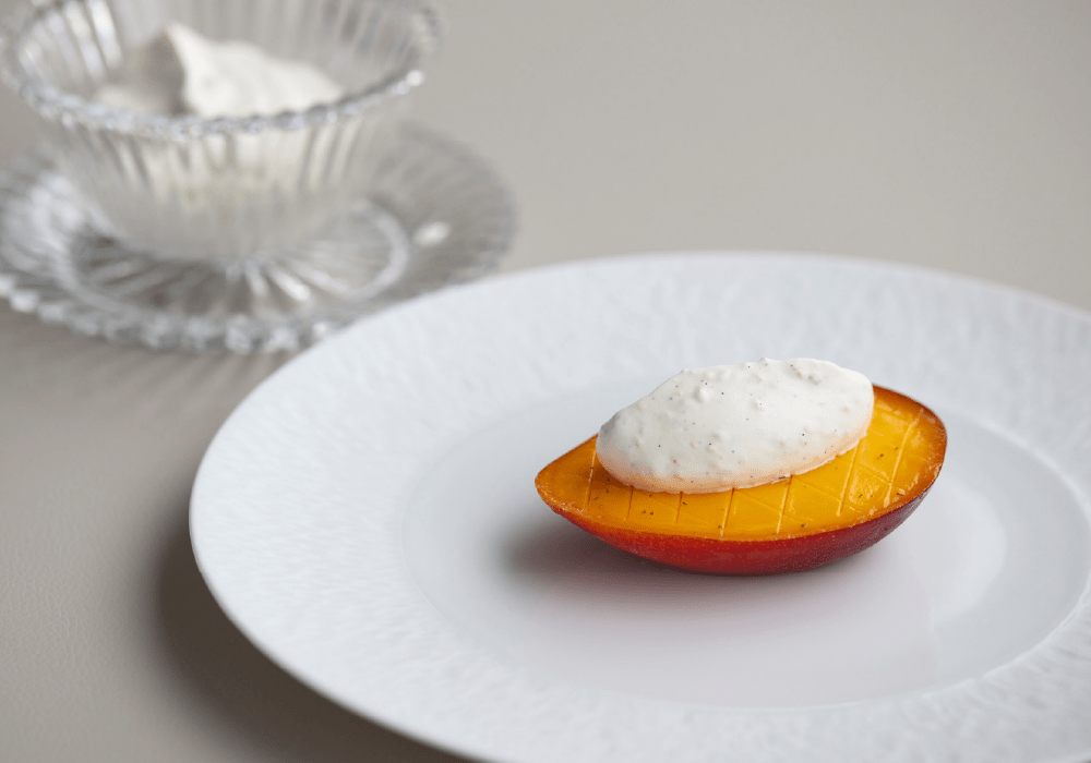 宮崎県産の甘いマンゴーの上には、スコットランド伝統菓子のショートブレッド入りのクレームシャンティがたっぷり。新鮮な果実の下にはマンゴーのソルベが隠れています。