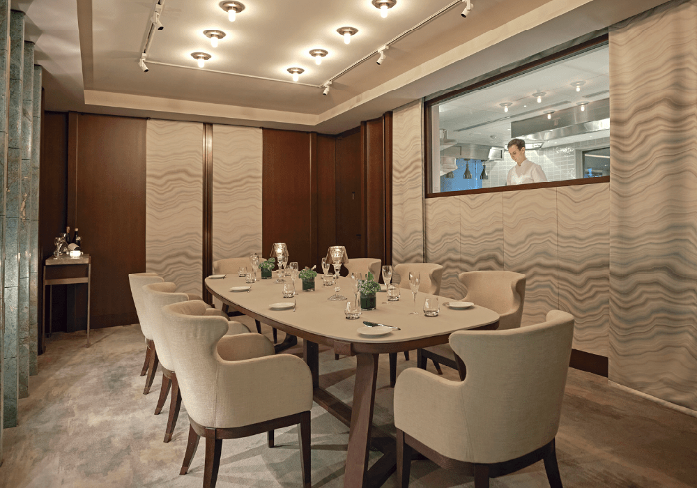 厨房の裏にある特別なシェフズテーブル席。個室に備えられた窓からは、厨房内で調理しているシェフの姿が見える。