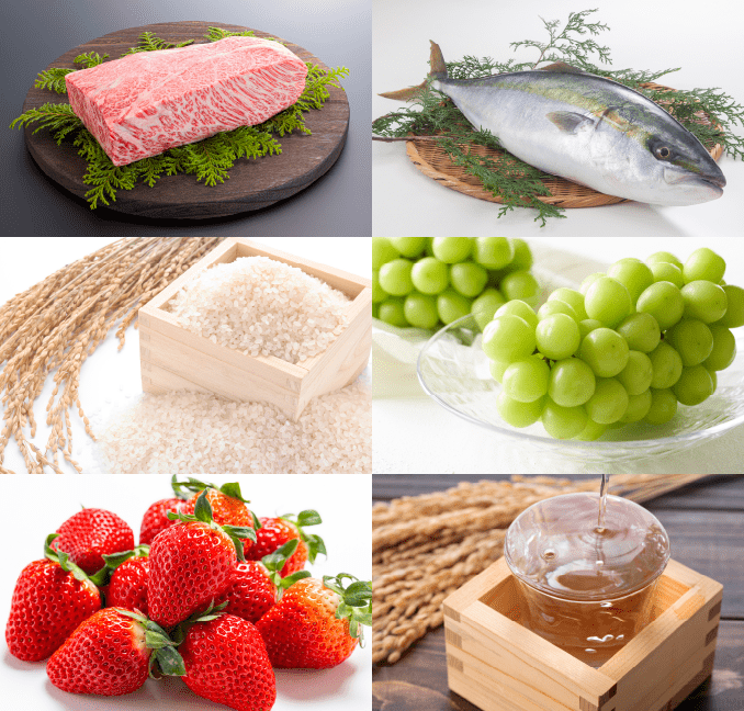 上段左から:牛肉、ぶり、米/下段左から:ぶどう、いちご、日本酒 上段左から:牛肉、ぶり/中段左から:米、ぶどう/下段左から:いちご、日本酒