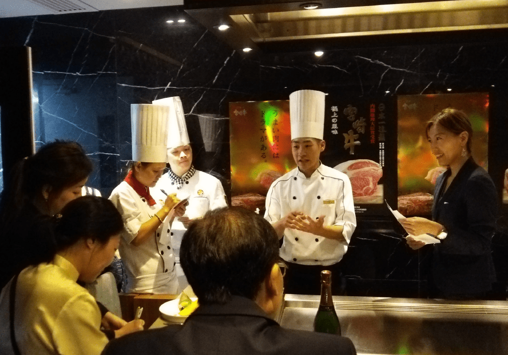 香港での営業の際は同社のシェフが同行し、現地スタッフのもと宮崎牛の調理をレクチャー。