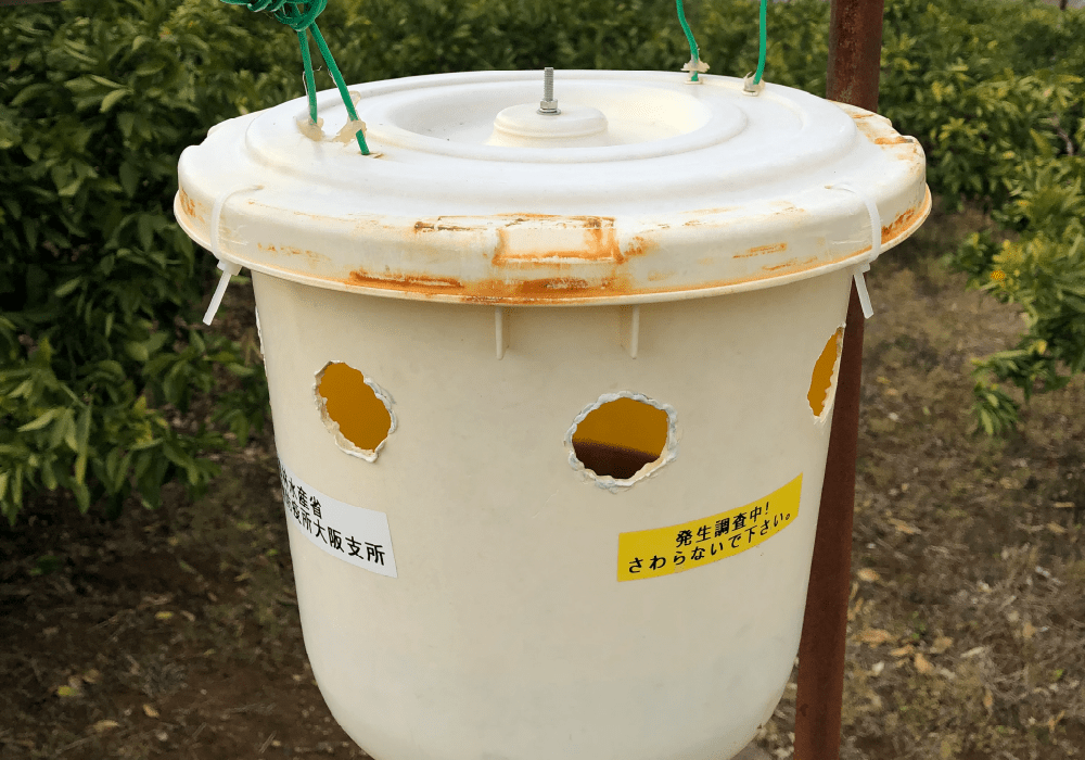 管内の生産者の方々の協力を得て登録した生産園地において、2021年4月から10月の約半年間にわたり、タンク内にエサを入れて害虫を捕まえる「ガロントラップ」を仕掛け、2週間に1回トラップに掛かった虫を回収。さらに6月からは、畑に落ちた未成熟のみかんも回収し、それらを神戸植物防疫所に送ってミカンバエの発生などがないことを確認する作業を続けてきました。