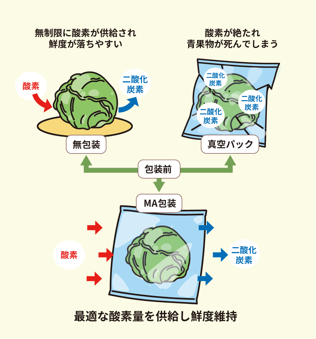 そこで役立つのが、MA(Modified Atmosphere)包装の技術です。これは、外気の透過を抑制することで青果物の呼吸を低下させ、パッケージ内を「低酸素、高二酸化炭素」状態にして鮮度を保持する技術です。青果物の呼吸によって徐々にパッケージ内の酸素濃度が低下し、青果物が冬眠状態になることで品質低下のペースをゆるやかにすることができます。MA包装に青果物を包んで封をするだけでよく、特殊な機器を導入する必要はありません。