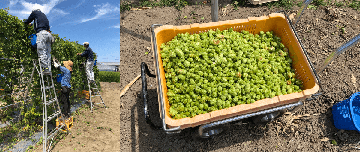 左:学内でのホップ栽培の様子。右:収穫したホップ。