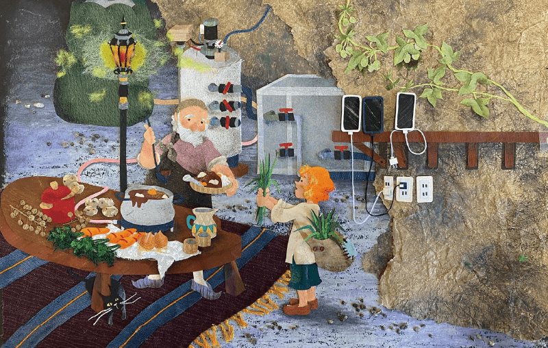 男の子が摘んできた雑草をおじいさんに渡し、おじいさんはその雑草からメタンガスを生産。そして、それを利用して作った温かなカレーを男の子に渡しています。また、おじいさんの左隣にはガス灯が灯り、男の子の右隣には充電されている携帯電話も描かれています。