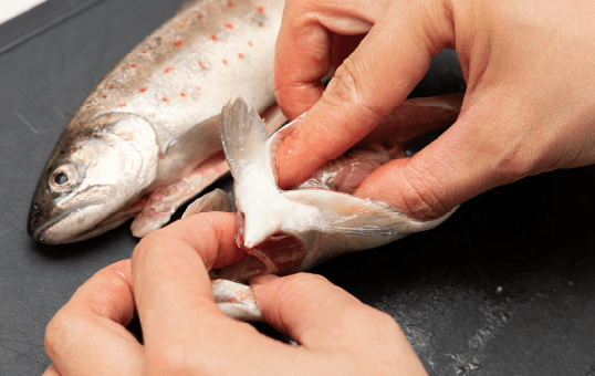 アマゴはキッチンバサミでお腹を縦に切り、内臓を取り出し水洗いをして、塩(分量外)を振っておく。