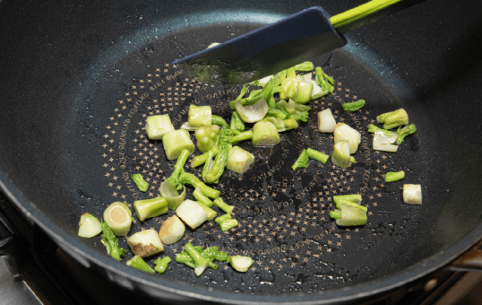 サラダ油をひいたフライパンに3を入れ、中火で緑が鮮やかになるまでさっと炒める。