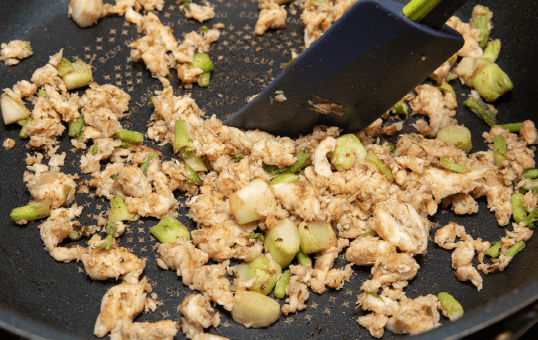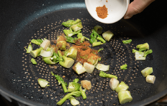 4にクミンと、ガラムマサラを入れて、全体が混ざるように炒め合わせる。