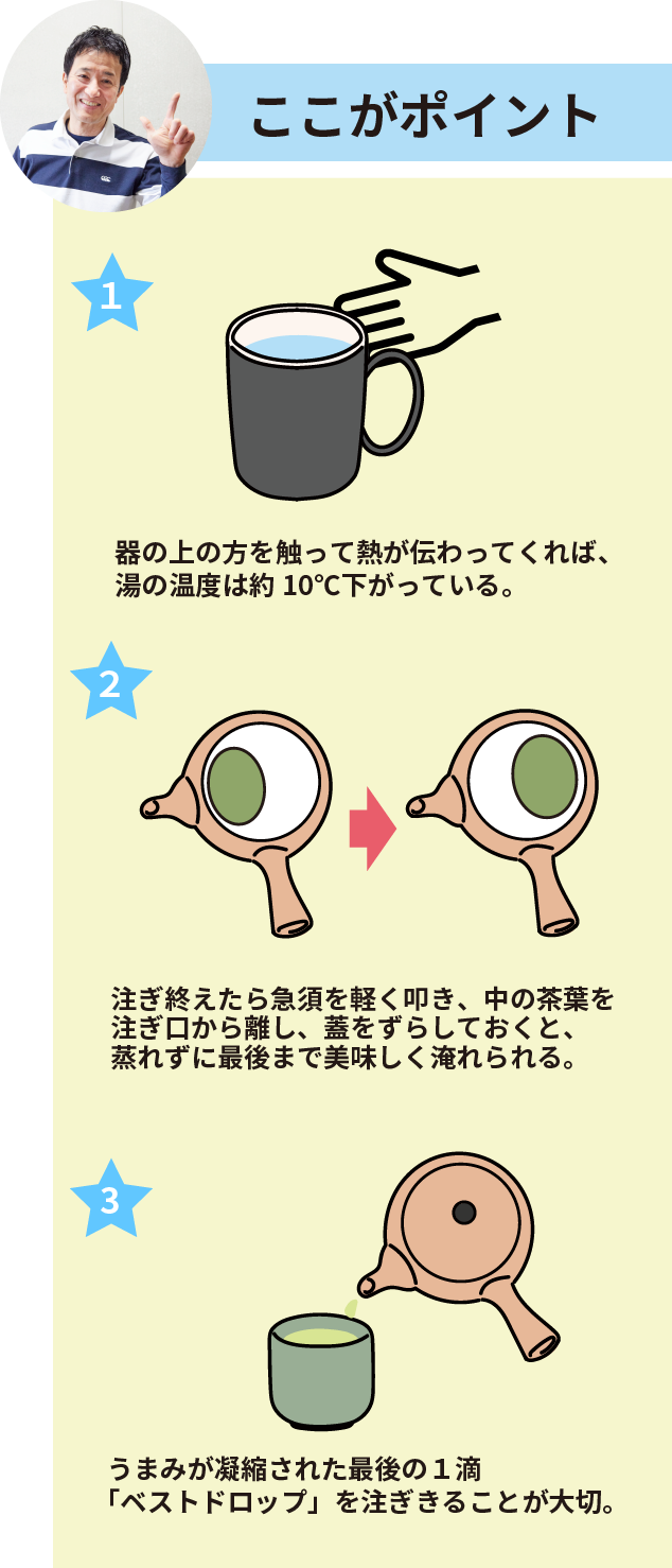 ポイントはお茶を淹れる時のお湯の温度。お湯が熱ければ、苦味や渋味成分であるカテキンが強くでてきてしまうのですが、お湯を冷ますことで、カテキンの抽出が減り、テアニンといううま味成分が前面に出てきます。あまり苦味や渋味がないのも物足りないですが、香りやうま味も含め味わいのバランスがうまく取れるお湯の温度は約70度です。また、急須の最後の1滴が「ベストドロップ」と言われ、うま味が凝縮されているので、最後の1滴まで注ぎきることが大切です。