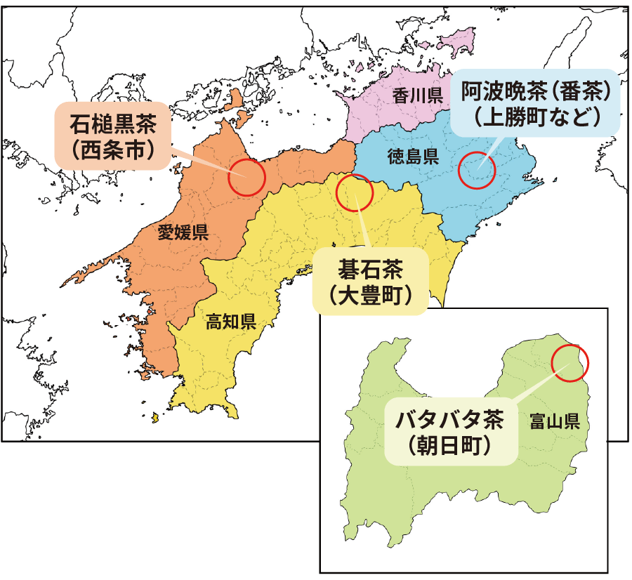 発酵茶(紅茶)や半発酵茶(烏龍茶など)は、茶葉自体に含まれる酸化酵素によって発酵させてつくるお茶ですが、「後発酵茶」は茶葉が持つ酵素の働きを熱によって止め、微生物の力で茶葉を発酵させてつくるお茶です。世界的に有名な後発酵茶として、中国のプーアル茶があります。日本にも代表的な4種類の後発酵茶があり、3種類は四国地方で、もう1種類は富山県で生産されています。摘んだ茶葉をすぐに加熱して自然発酵(植物内在酵素)を抑制し、その後、お茶ごとに真菌(カビ)や酵母、乳酸菌などにより発酵させて作られていて、独特の香りと酸味が特徴のお茶です。