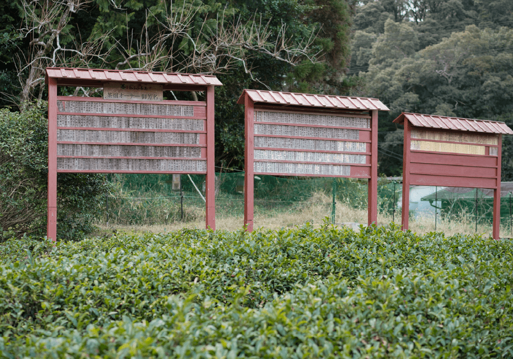 おぶぶ茶苑の敷地内には、茶畑オーナー名が掲示がされており、外国の方の名前も。