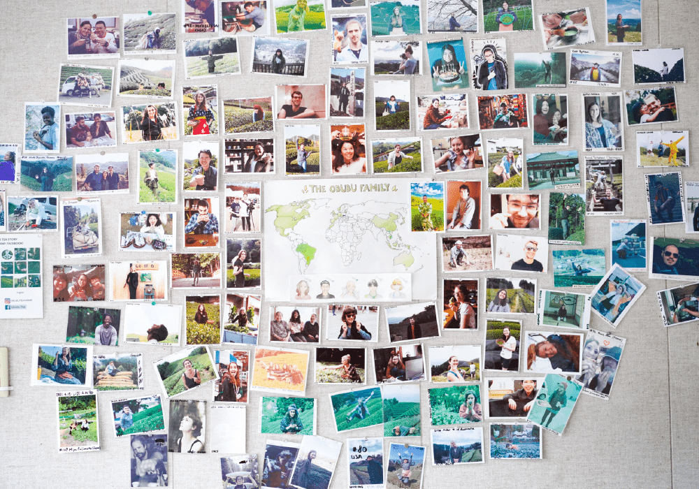 おぶぶ茶苑の壁には、世界中に広がる「OBUBU FAMILY」(インターン参加者)の写真が貼ってある。