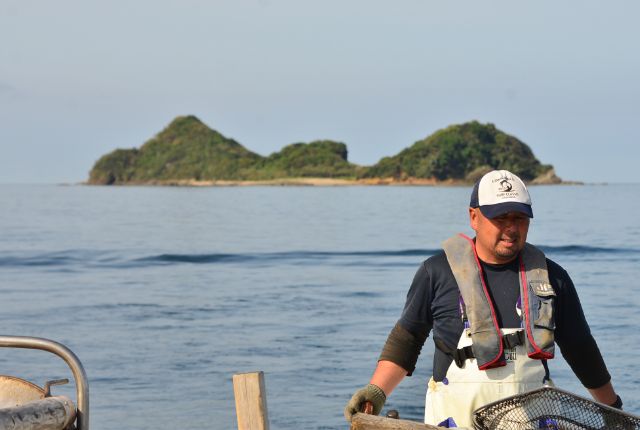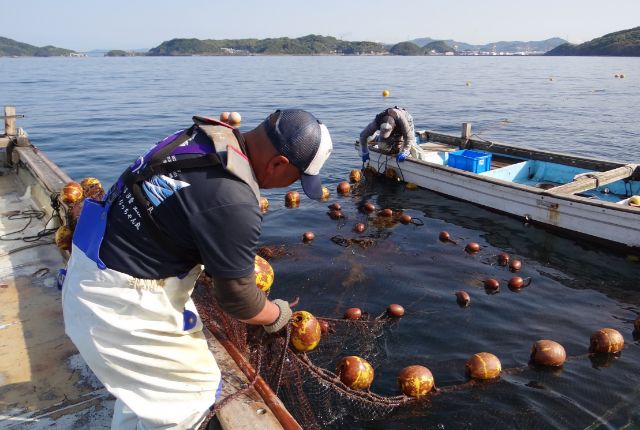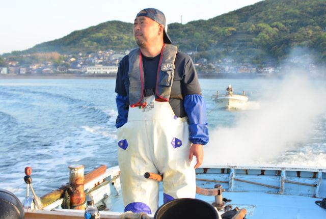 車で10分移動し、野母半島をはさんで反対側にある蚊焼(かやき)漁港へ。再び船を出し、操業が始まります。台風の襲来時などを除き、為石の漁場が荒れていても蚊焼の漁場は凪いでいることが多く、両方で漁ができないということはめったにないといいます。