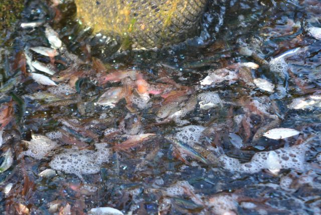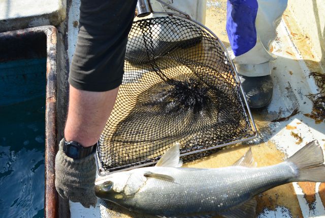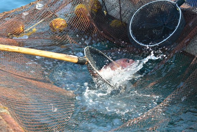 タモで魚をすくい上げながら、活魚槽に入れて生かしておく魚、すぐに氷締めする魚を瞬時に選別します。またヒラメなどいくつかの魚は出荷調整のため、海上にある生け簀に移していました。必要な魚を必要なときに出荷できるようにするための措置です。