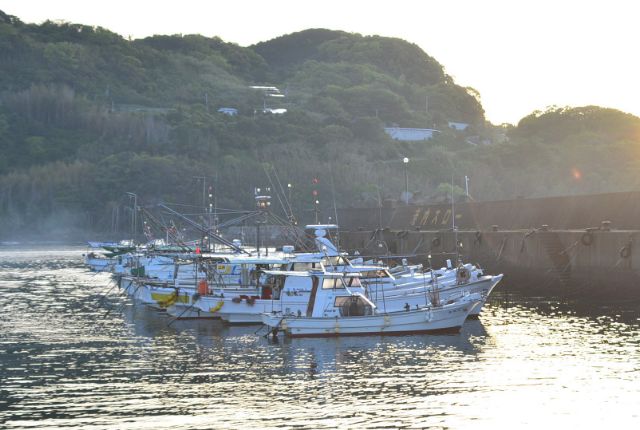 東の水平線から陽が昇り、海面を朱に染めます。サギが海上を優雅に舞っています。清澄な空気の中、野母半島中央東岸に位置する為石(ためし)漁港から、平山孝文さんの7トン漁船「明星丸」が、沖合300メートルにある小型定置網の漁場を目指し出港しました。そのあとを兄・久樹さんの漁船が追っていきます。2人は力を合わせて“兄弟船”での定置網漁を行っているのです。
