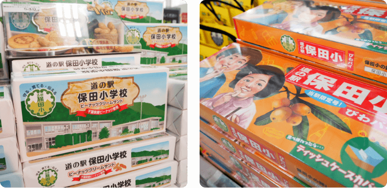 直売所「きょなん楽市」には、100種類以上もの「道の駅 保田小学校オリジナル商品」がずらり。施設が企画開発したお菓子や文房具は、ここでしか買えないため、多くの人がお土産用に買い求めるそうです。オリジナル商品目当てのリピーターも多いといいます。