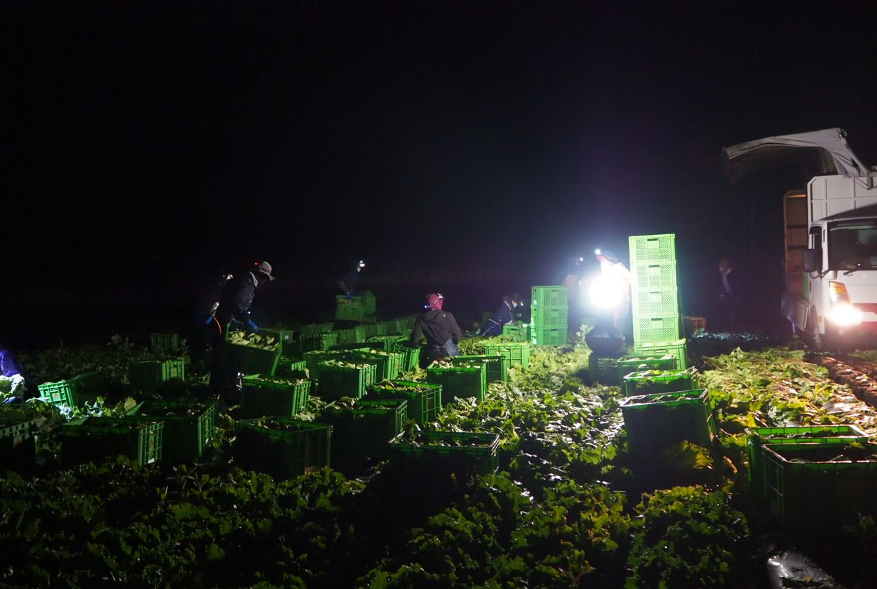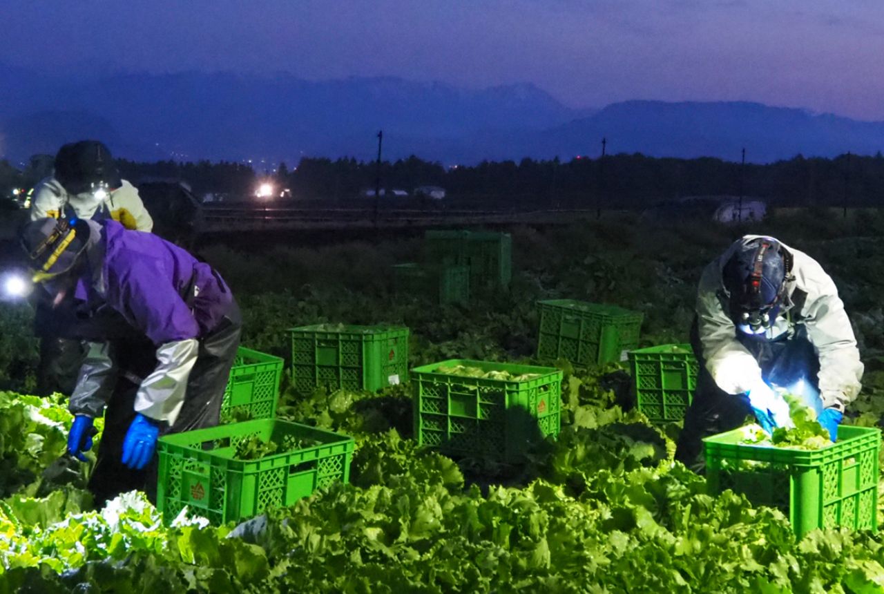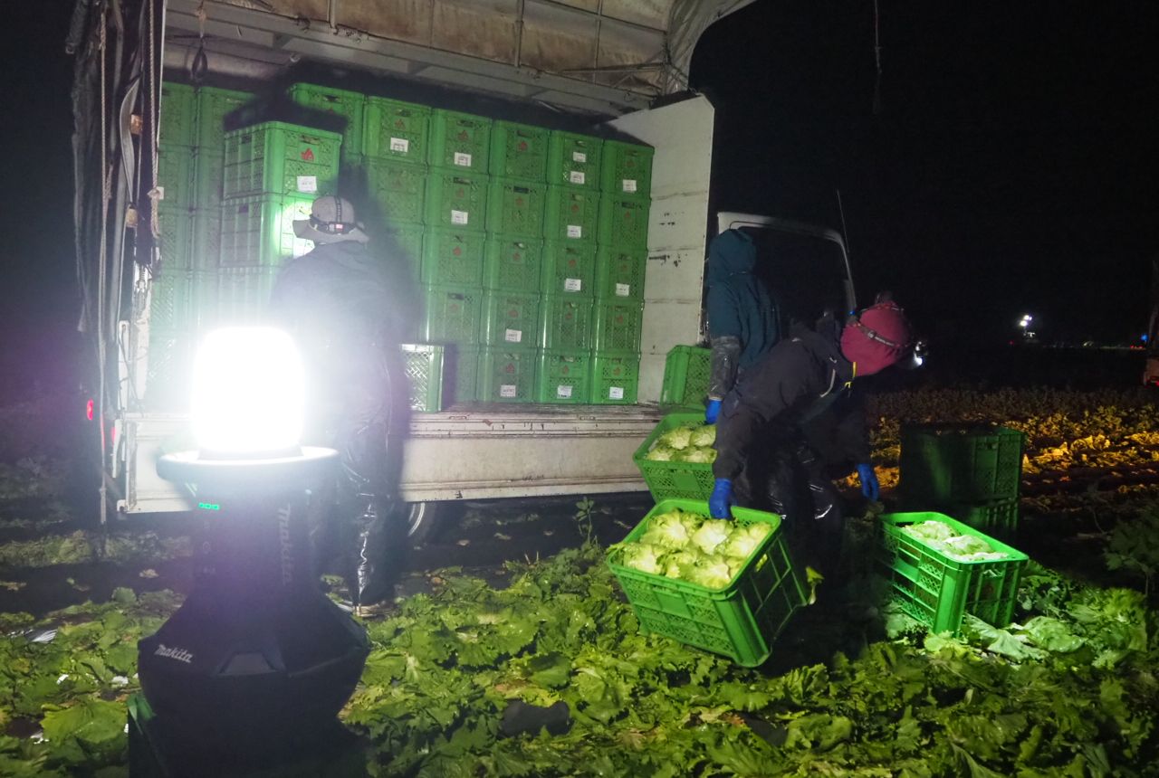 「農園星ノ環」の朝は早い。レタスは暑さに弱いので、気温の低い午前3時から収穫作業がスタートします。この日の収穫隊は農場長、パート2名、インドネシア人実習生7名の計10名。夜明け前の暗闇の中で、置き型照明とヘッドライトの光を頼りに、次々レタスを刈り取っては、手際よくコンテナに詰めていきます。