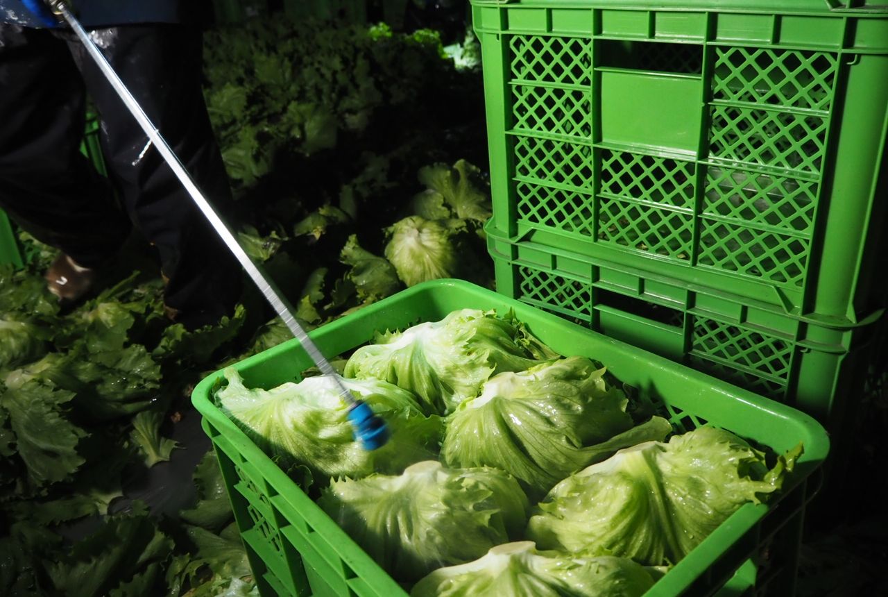 レタスは切り口から出る白い液が空気に触れると、酸化して傷みや変色のもとになります。収穫してすぐに霧状の水を吹きかけ、切り口を洗浄します。
