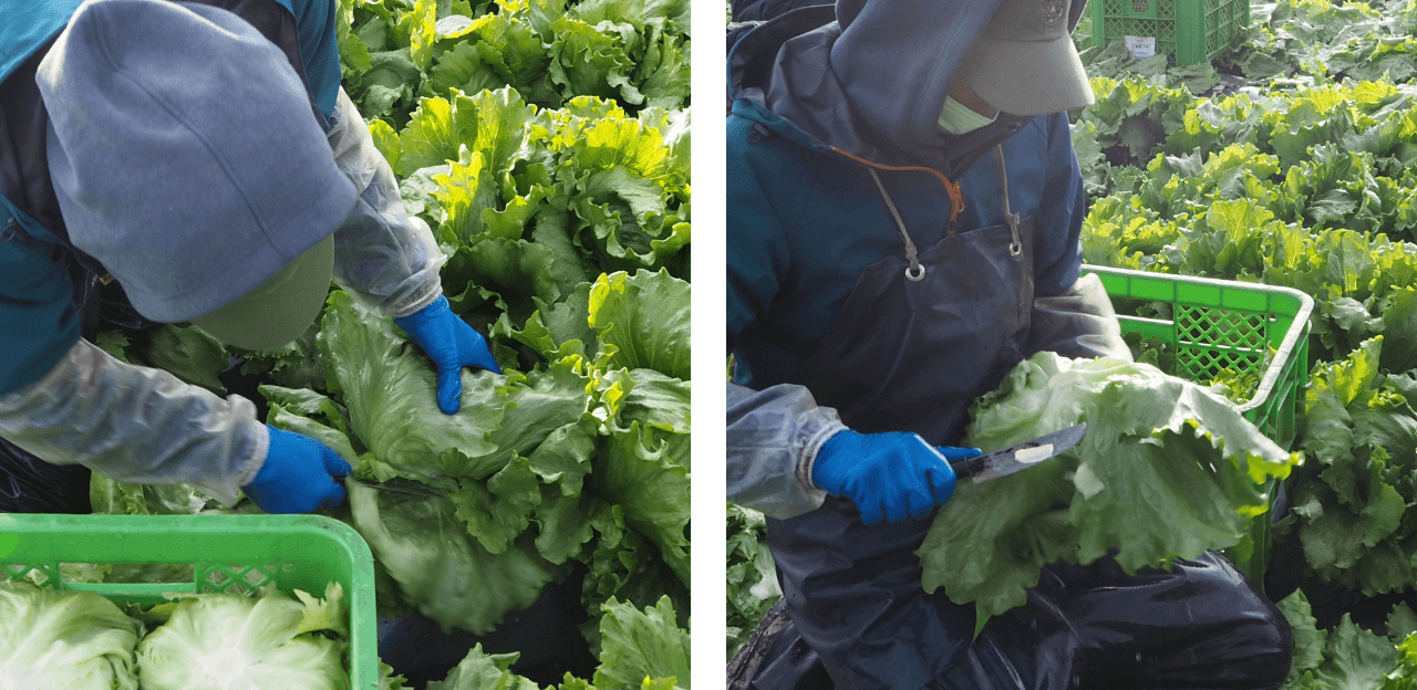 収穫用包丁でレタスを切り離し、不要な外葉を取って、根元を切り直します。動きがスムーズなので、一見簡単な作業に見えますが、実はかなり難しい。きれいに速く切るためには、プロの技が必要です。切り方が汚いとレタスの商品価値が下がってしまうので、みなさん真剣そのものです。