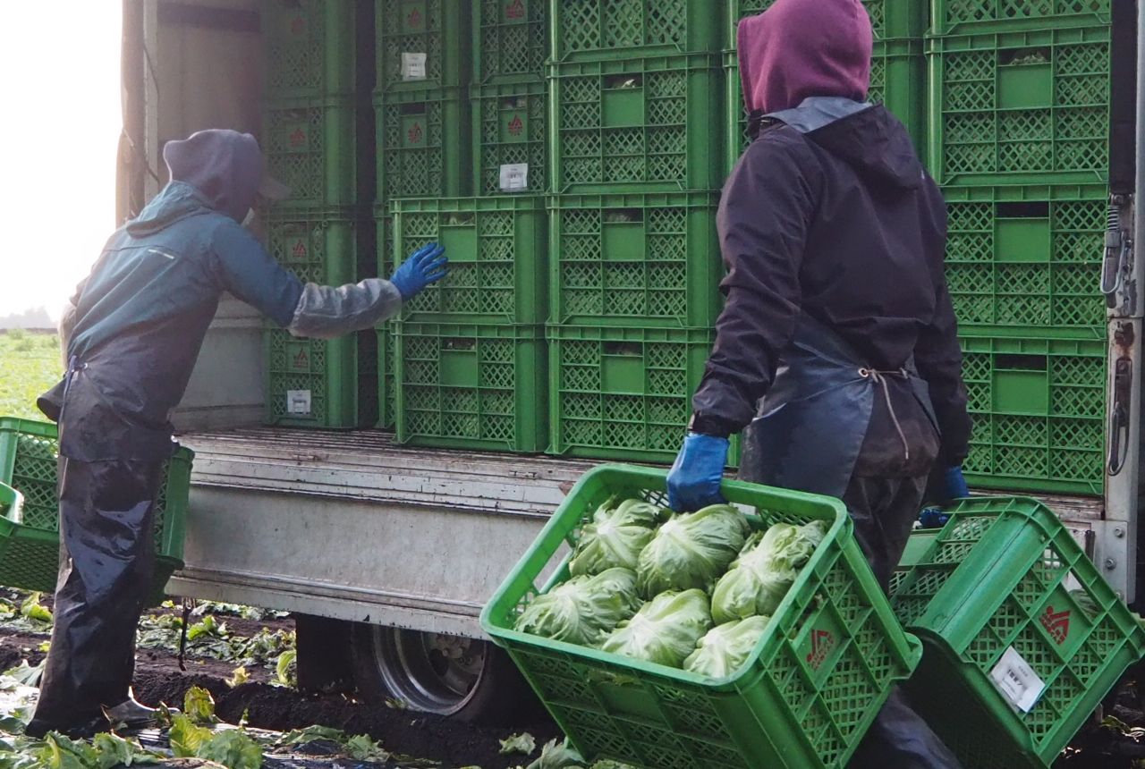 レタスは軟らかい野菜なので、取扱いに注意しなければなりません。見ていると、赤ちゃんを扱うように優しく持っています。コンテナやダンボールへの詰め方も、美しさと速さが求められます。葉脈の向きを揃えて入れるのがポイントです。