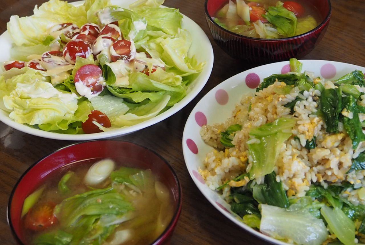 事務所に戻り、疲れた体を休めます。収穫体験の来客があったりすると、休憩時間にみんなで朝食をとることもあるそうです。そんなときは、収穫したばかりの新鮮なレタスをたっぷり使ったメニューが食卓にずらり。この日のメニューは、サラダとみそ汁とチャーハン。農園だから叶う贅沢な朝ごはんを楽しみます。