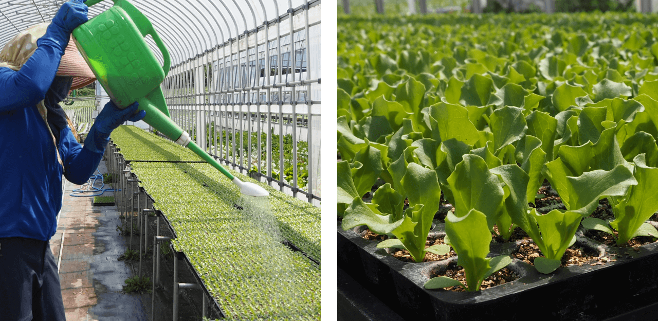 休憩したら、再び作業開始。従業員はそれぞれ違う作業に取りかかります。午前中にやるべきことの一つが灌注。気温が上がる前に、ビニールハウス内で育てている苗に、栄養を吸収しやすくする薬液を散布します。こうすることで、畑に定植後も健全な生育が期待できるそうです。それにしても、こんな小さな葉っぱが、あの丸くて大きなレタスに成長するのですね。