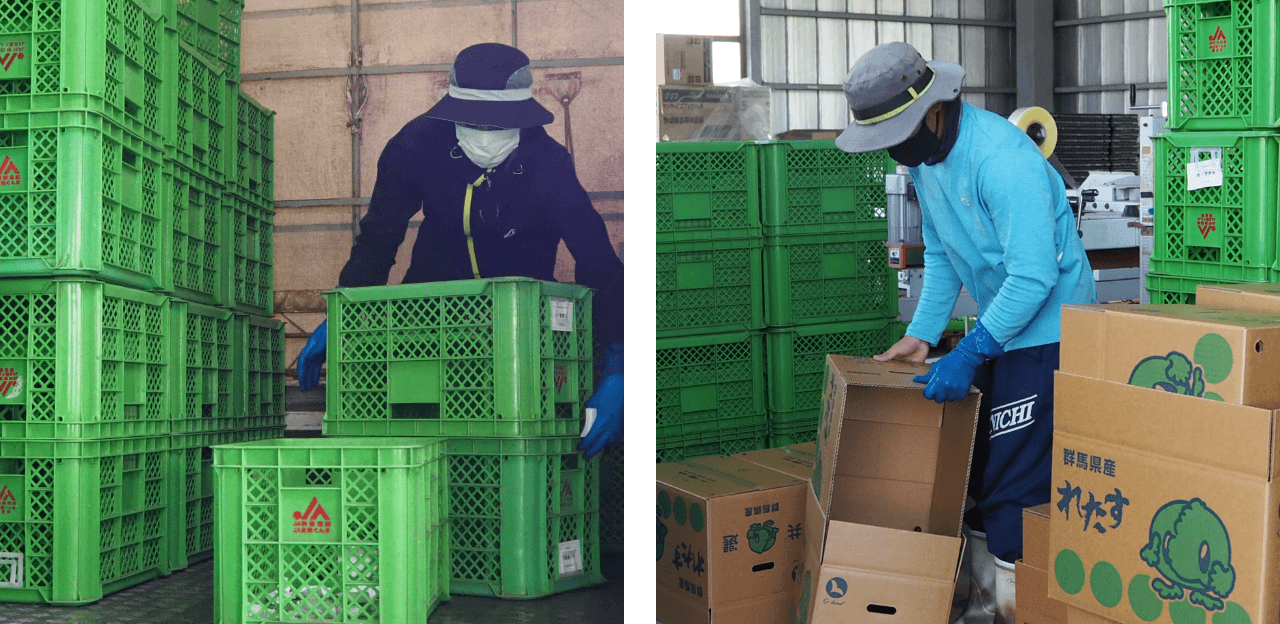 翌朝の収穫で使うコンテナをトラックに積み込んでいる人、ダンボール作りをしている人もいます。さらにJAの育苗センターに苗を取りに行く、マルチを敷く、種をまく、畑で定植するなど、お昼休憩までの作業は枚挙にいとまがありません。