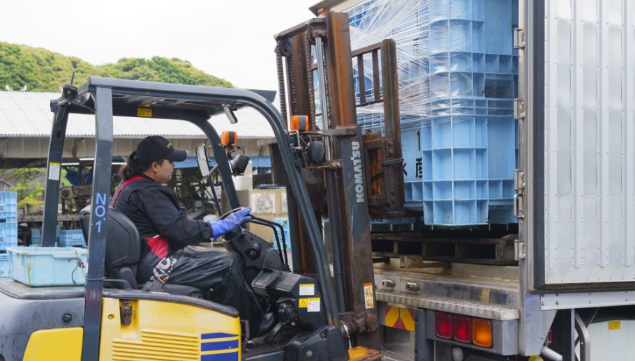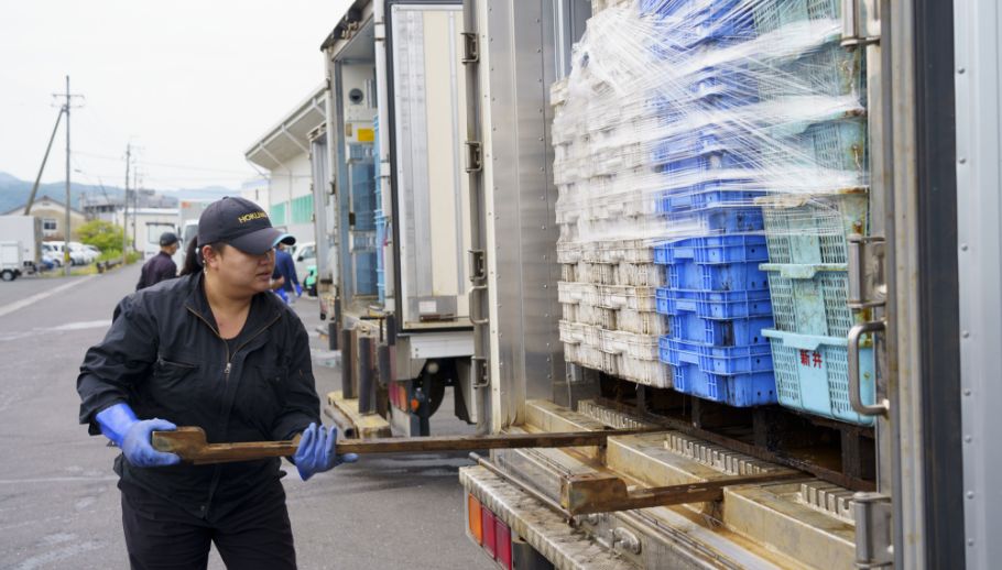 魚種や型ごとに選別された魚をコンテナや発泡スチロールへと梱包後、見事なハンドルさばきでフォークリフトを操縦しトラックへと積み込む。「多分、京都の女性のなかで一番上手いかな」と笑う。