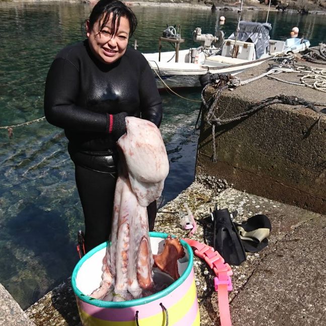 海女漁では、なんと32キログラムもの大タコが獲れたことも!「だから楽しいんです。もちろん、獲りすぎは厳禁。持続可能な漁のため、例えばサザエなら獲れても10キログラムまでなど上限を決めています」