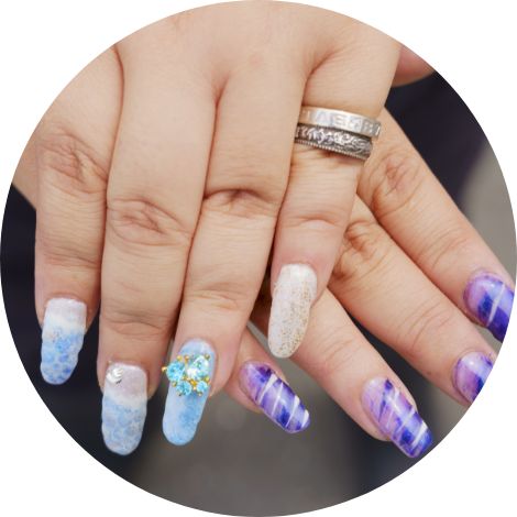 早朝6時前の始業にも関わらず、カラコンやつけまつげなどメイクもバッチリ!「鎧みたいなもの。メイクが決まると気合が入るのです」。ネイルの色は、大好きな海と同じマリーンブルーでコーディネイト。