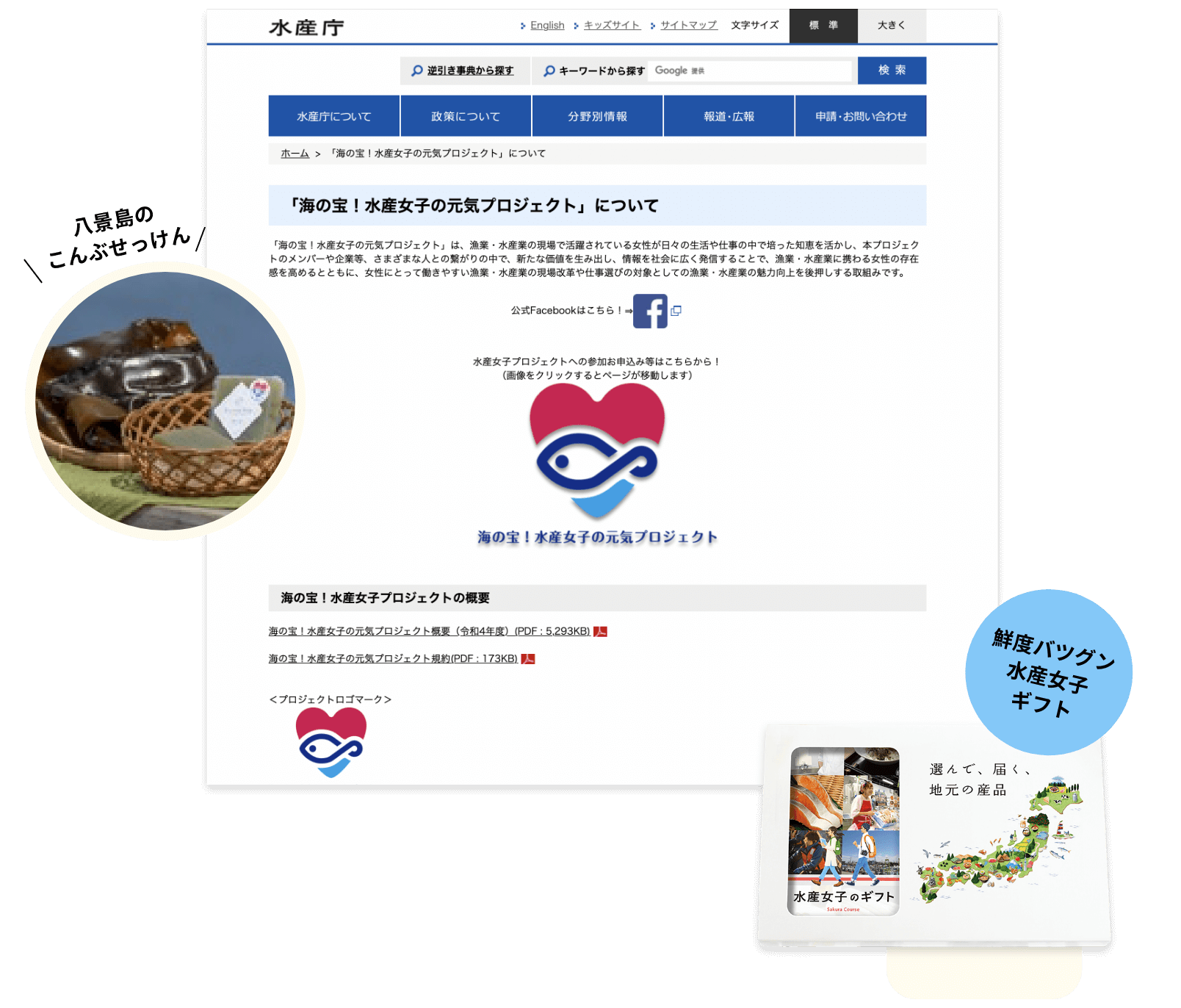 全国の水産女子が参加する「海の宝!水産女子の元気プロジェクト」は、メンバーの日々の生活や仕事、そして、自然との関わりのなかで培った知恵と経験を、企業や団体の技術力、ノウハウなどと掛け合わせることで、新しい商品やサービス、情報を創造し、社会全体へと発信しています。