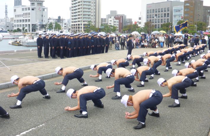 練習船の出航に際し、1、2年生の有志により行われる見送りの儀式「スタンバイ」。遠洋航海の安全を祈り70年以上も受け継がれる水産大学校の伝統だ。独特な動きは、船に入った水を掻き出す動作を表している。