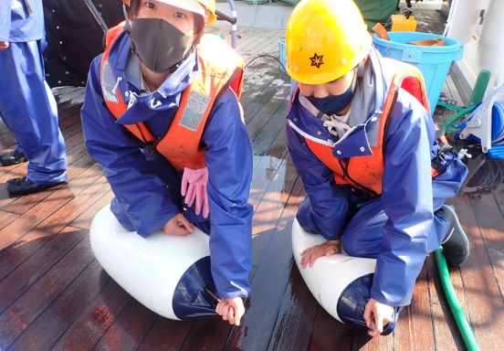 「耕洋丸」での航海実習中、利用した緩衝材のエアー抜きを行う。「航海実習では船橋当直や甲板作業など実践的な内容を学びます」