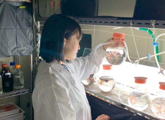 海藻類の非生物的ストレス耐性の強化について研究する藤井さん。「研究成果のプレゼンなど、実践的なスキルも身につきます!」