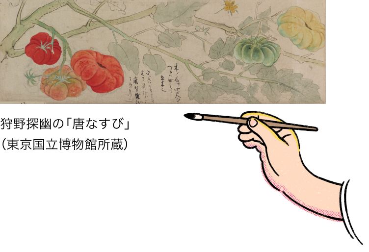 16世紀から17世紀にかけて、ヨーロッパ人のアジア進出と共にトマトも西洋から東洋へ伝わっていきました。日本にトマトが伝来したのは17世紀なかばとされています。江戸時代初期の絵師、狩野探幽が1668年に「唐なすび」と称してスケッチを残しているほか、本草学者・儒学者の貝原益軒は『大和本草』(1709年)で、トマトについて「唐ガキ(柿)」と紹介しています。日本でも当初はヨーロッパ同様に鑑賞用として珍重されていて、食用として利用されるようになったのは明治時代に入ってから。キャベツやタマネギなどの西洋野菜と共にあらためて欧米から導入されました。