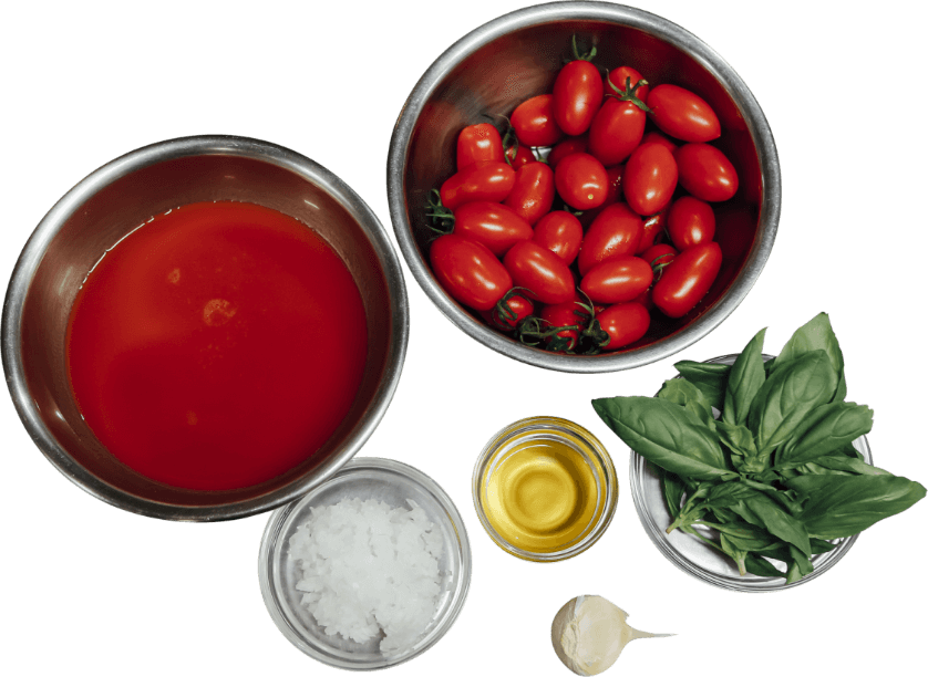 イタリアの郷土料理の手法を用いること。そして、日本の旬の食材を活かすこと。この2点にこだわって「日本人のためのイタリアン」を追求してきた「リストランテ アクアパッツァ」の日髙良実シェフ。店で使用する食材の調達先は、可能な限り産地に出向き、自分自身の目で確かめて選んでいるそうです。「野菜については埼玉県草加市や山形県河北町などの農家さんから仕入れています。食材は鮮度が命なので、シェフにとっては必要な食材を必要な時に手に入れられるかが重要です。そういう意味で相性のよい農家さんと巡り会えたことに感謝しています」。そんな日髙シェフに、ミニトマトを使った「南イタリア風トマトソース」と、それを活用したパスタとリーゾ(リゾット)を教えていただきました。「北イタリアでもトマトは使いますが、ニンジンやセロリなど他のさまざまな野菜とともに使うのに対し、南イタリアではトマトとニンニクだけといった具合にシンプルに調理するのが一般的です」。トマトソースも南イタリア発祥ですが、とくにナポリを中心とするカンパニア州では生のミニトマトを使う点が特徴で、今回のトマトソースもそれがベースになっています。「ただし、生のミニトマトだけでは味を一定にさせるのが難しいので、トマトジュースやピューレーなどを使い、そこに生のミニトマトを加えるというやり方にしています。これなら誰がつくってもおいしくできます。ぜひ挑戦してみてください」